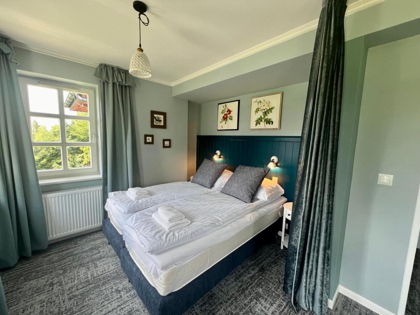Apartament typu Deluxe. This apartments special features are the sauna and the fireplace. Featuring a private entrance, this spacious apartment also is comprised of 1 living room, 1 separate bedroom and 2 bathrooms with a shower. Guests will find a stovetop, a refrigerator, kitchenware and a tea and coffee maker in the fully equipped kitchen. The apartment also has a barbecue. The apartment features carpeted floors, a seating area with a flat-screen TV, a wardrobe, a sofa as well as garden views. The unit offers 6 beds. Apartament - 7 osobowy. Powierzchnia pokoju ok.: 70 mkw. ;