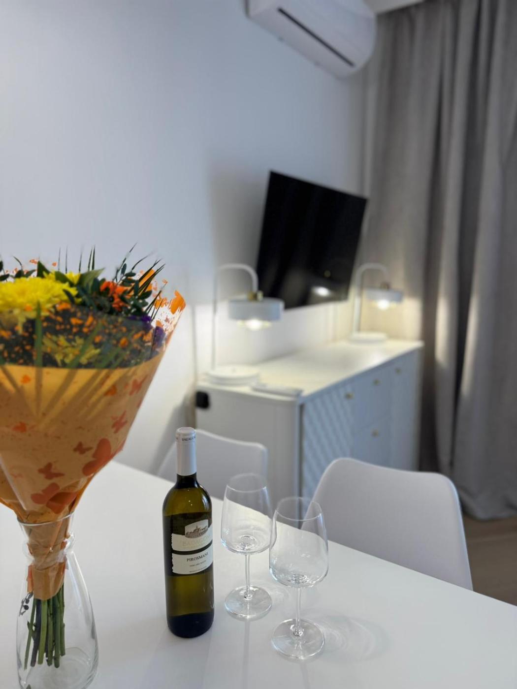 W apartamencie znajduje się telewizor z płaskim ekranem. Na miejscu znajduje się kuchnia.